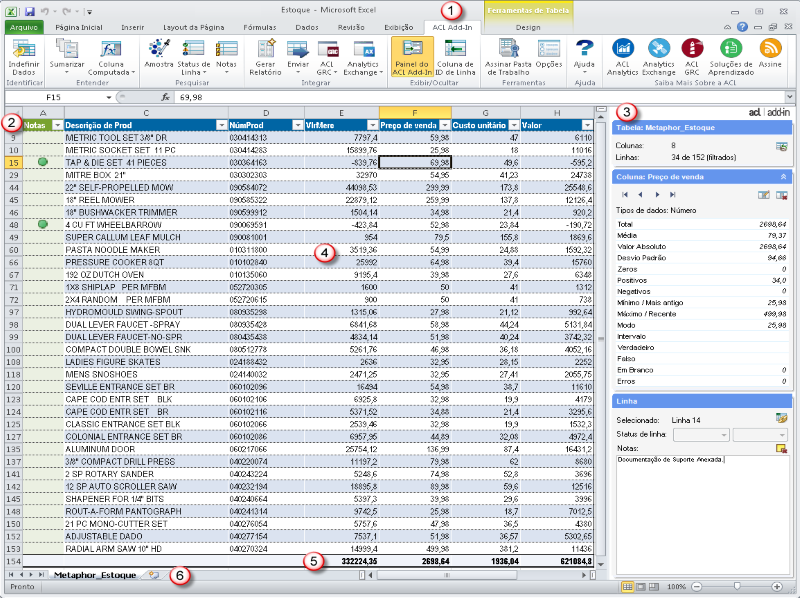 | 4 | Tabela do ACL Add-In | Uma tabela somente leitura, o que impede alterações acidentais de dados. Essa tabela inclui estatísticas geradas automaticamente, como totais, médias, mínimos e máximos de colunas numéricas e duração de intervalos de datas, exibidas no painel do ACL Add-In. Funcionalidades padrão do Excel, tais como classificação, filtragem, Tabelas e Gráficos Pivot, podem ser usadas com tabelas do Add-in para Excel. |