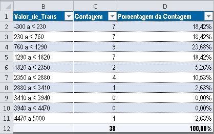 Você está trabalhando com uma tabela de contas a receber e precisa encontrar o número total de transações por intervalo de quantia. Para isso, você estratifica os dados usando a coluna de quantia de transação e calcula o subtotal dessa coluna.