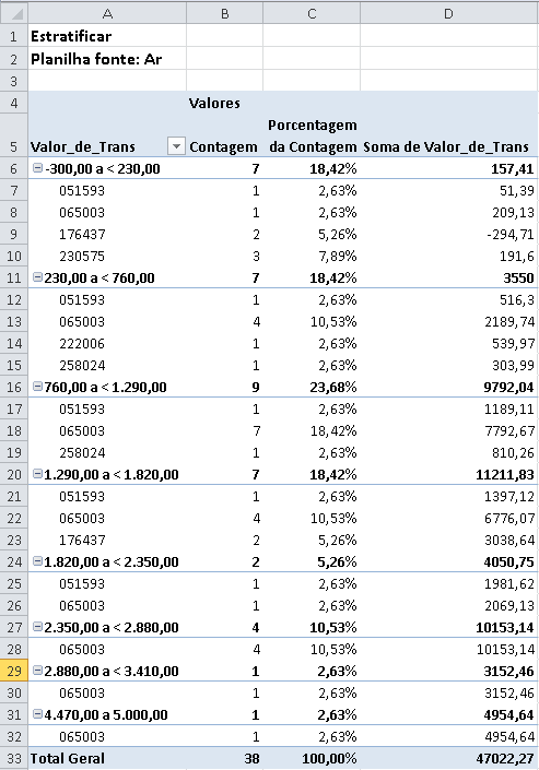 Se você enviar os resultados da estratificação para uma Tabela Pivot ou Gráfico Pivot, você poderá agrupar ainda mais os intervalos de estratificação pelos valores em colunas adicionais.