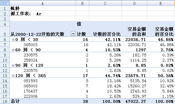 您正在处理应收帐款表,您需要找出每个帐龄分析周期的交易总数。为此,您使用到期日域对数据进行账龄分析,并且小计交易金额列。