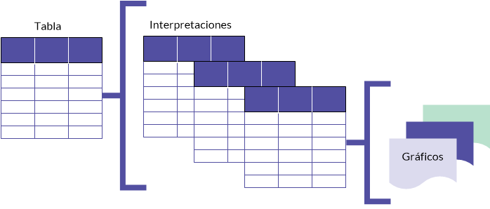 Una interpretación contiene una vista de la tabla de los datos que puede filtrar, ordenar o formatear. A continuación, puede agregar uno o más gráficos a la interpretación para visualizar los datos en la vista de la tabla.