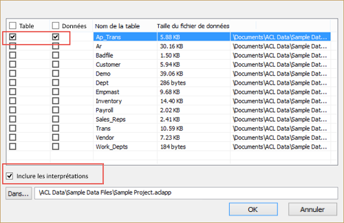 Par défaut, les exemples de projets de données sont installés sous C:\Utilisateurs\nomutilisateur\Documents\ACL Data\Exemples de fichiers de données dans votre système de fichiers local.