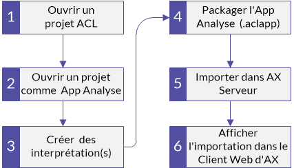 Pour ce faire, vous utilisez ACL Analytics pour ouvrir le projet, puis vous créez l'interprétation dans la fenêtre App Analyse. Une fois l'interprétation créée, vous compressez l'App Analyse et vous l'importez dans AX Serveur pour qu'elle soit prête à être utilisée avec les données des résultats des outils d'analyse.