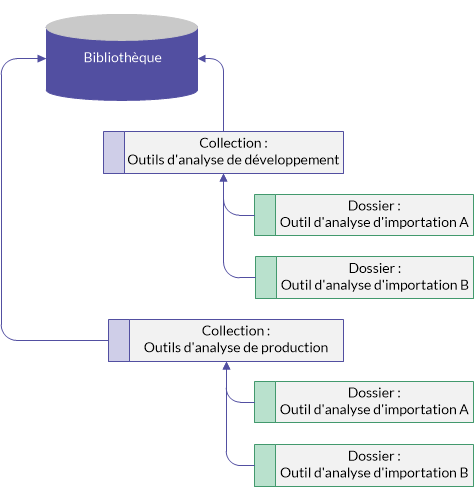 Créez une collection de bibliothèque nommée Développement d'outils d'analyse d'importation. Cette collection contient les outils d'analyse en phase de test et de développement. Les tâches exécutées à partir de cette collection ont accès à l'instance de base de données en transit et sont isolées des données de production.