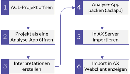 Dazu verwenden Sie ACL Analytics, um das Projekt zu öffnen und die Interpretation im Fenster „Analyse-App“ zu erstellen. Sobald Sie die Interpretation erstellt haben, packen Sie die Analyse-App und importieren das Paket in AX Server, sodass es zur Verwendung mit Analyseergebnissen zur Verfügung steht.
