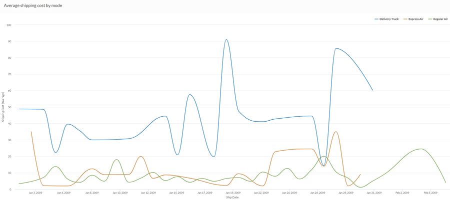 En s'appuyant sur les données commerciales du dernier mois, vous voulez afficher la tendance du coût d'expédition moyen pour chaque méthode d'expédition utilisée par votre organisation. Pour ce faire, vous utilisez une courbe qui regroupe chaque série par méthode d'expédition :