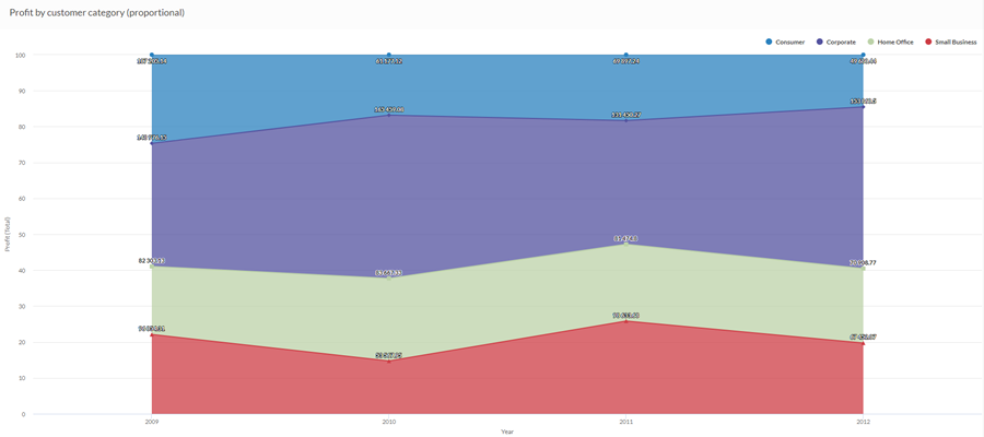 En vous appuyant sur les données commerciales agrégées sur une période de 4 ans, vous devez expliquer de quelle manière les ventes dans les différents segments client ont changé au fil du temps. Pour ce faire, vous créez un graphique en aires empilées 100% qui présente la manière dont chaque segment a évolué par rapport au total au fil du temps :