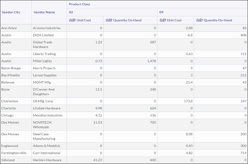 テーブルでは、定義したクロス集計にベンダー データを要約し、単価と数量の値に和演算を実行します。 行は、まずベンダーの都市順に並べ替えられ、次に各都市内でベンダー名順に並べ替えられます。