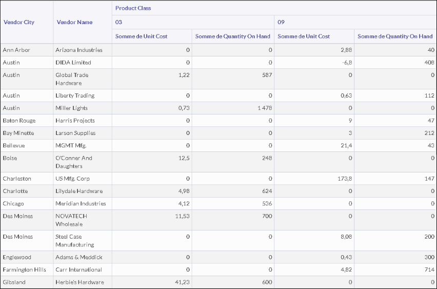 La table résume les données des fournisseurs dans la tabulation croisée que vous avez définie et effectue des calculs de somme pour les valeurs correspondant aux coûts unitaires et aux quantités : Les lignes sont d'abord triées par Ville fournisseur, puis par Nom du fournisseur à l'intérieur de chaque ville :