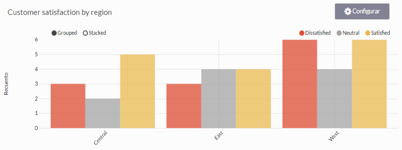 Debe proporcionar una visualización para la calificación de satisfacción de los clientes por división regional dentro de su compañía. Para visualizar estos datos, usted escoge un gráfico de barras agrupadas y, a continuación, utiliza colores para asociar los niveles de satisfacción con significado:
