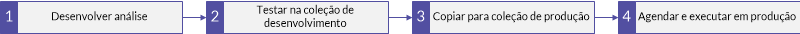 Por fim, implante as análises testadas copiando-as da coleção de desenvolvimento e colando-as na coleção de produção. Agora você pode agendar as tarefas a serem executadas em relação aos dados de produção, usando as credenciais de produção, e a análise será totalmente isolada do ambiente de desenvolvimento.