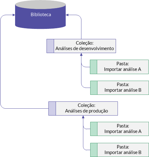 Crie uma coleção de Biblioteca chamada Importação de desenvolvimento de análise. Essa coleção armazena análises que estão na fase de teste e desenvolvimento. Qualquer tarefa executada dessa coleção acessa a instância do banco de dados de preparação e é isolada dos dados de produção.