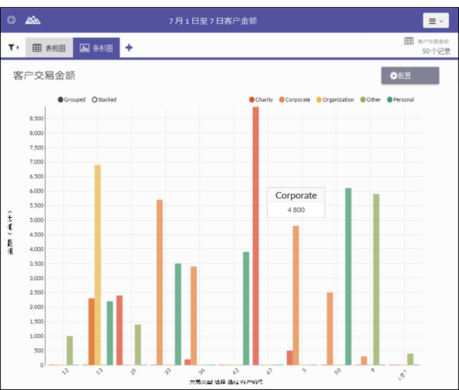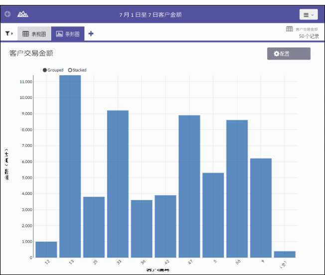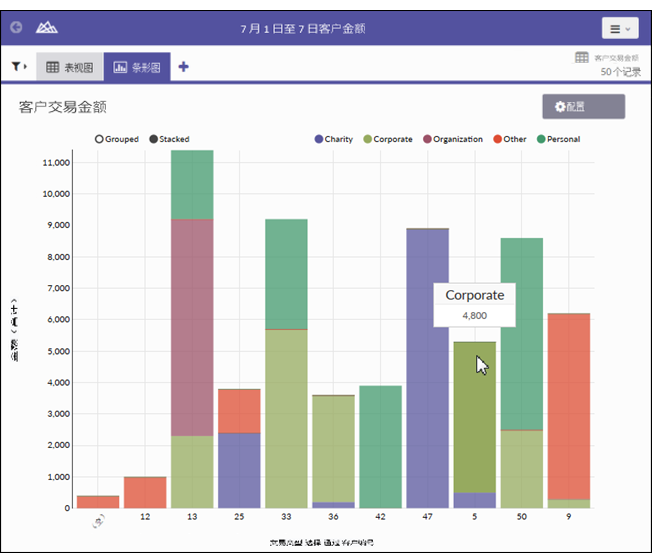总值由图表的纵轴表示。您可以为表中的不同数字列选择 X 轴字段的计数或几个合计值之一: