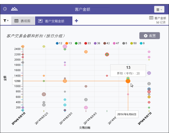 该数值字段将用来确定各个数据点的大小。大小的增加指示数量或值的增加。您可以为表中的不同数字列选择 X 轴字段的计数或几个合计值之一: