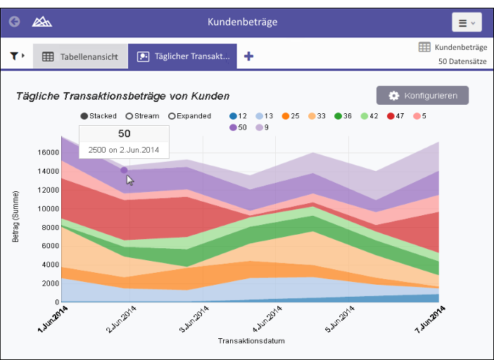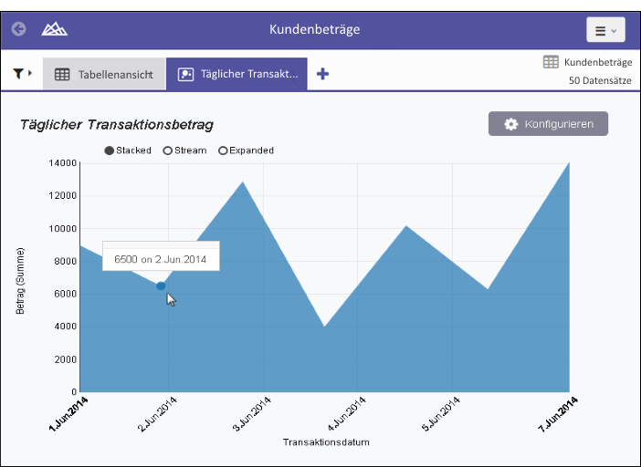 Die Ansichtsoptionen für das gestapelte Flächendiagramm können in der oberen linken Ecke des Diagramms geändert werden: