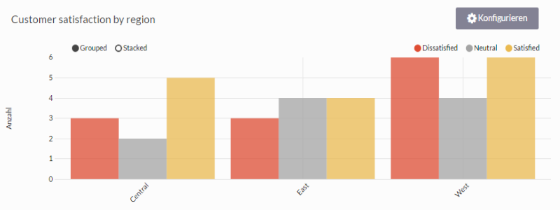 Sie möchten eine Visualisierung liefern, in der die Ratings der Kundenzufriedenheit nach regionalen Divisionen in Ihrem Unternehmen dargestellt sind. Um diese Daten zu visualisieren, wählen Sie ein gruppiertes Balkendiagramm und setzen dann Farben ein, um die Einstufung der Kundenzufriedenheit mit deren Bedeutung zu verknüpfen: