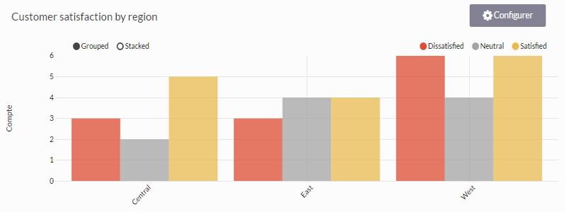 Vous devez fournir une visualisation correspondant aux taux de satisfaction de vos clients par division régionale de votre entreprise. Pour visualiser ces données, vous choisissez un graphe à barres, puis vous utilisez des couleurs pour associer les taux de satisfaction à la signification du chiffre :