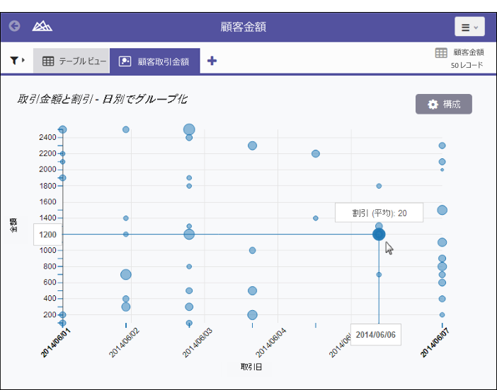 個別のデータ ポイントのサイズを決定するために使用する数値フィールド。サイズが大きくなると、数量または値が増加します。X 軸フィールドのカウント、またはテーブルの異なる数値列の複数の集約値の 1 つを選択することができます。