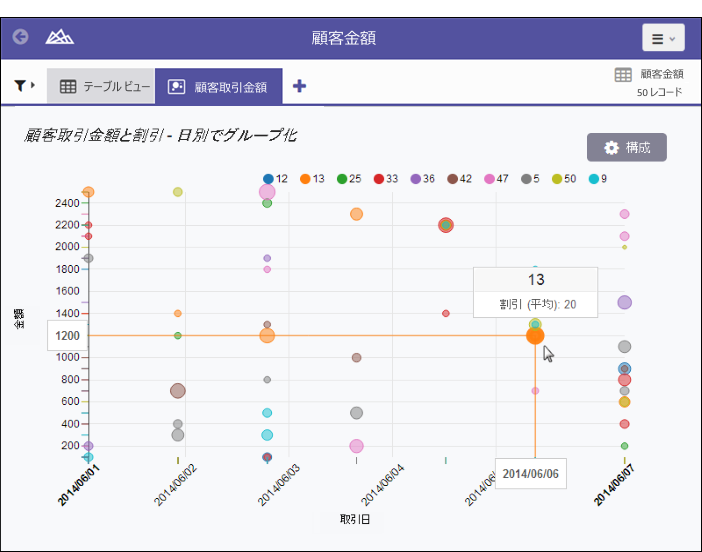 グラフの 4 番目のデータ次元で表されるフィールド。4 番目のデータ次元を追加すると、カテゴリ別のデータ ポイントを特定します。[色付けの基準]フィールドはブレーク フィールドと見なすことができます。 |