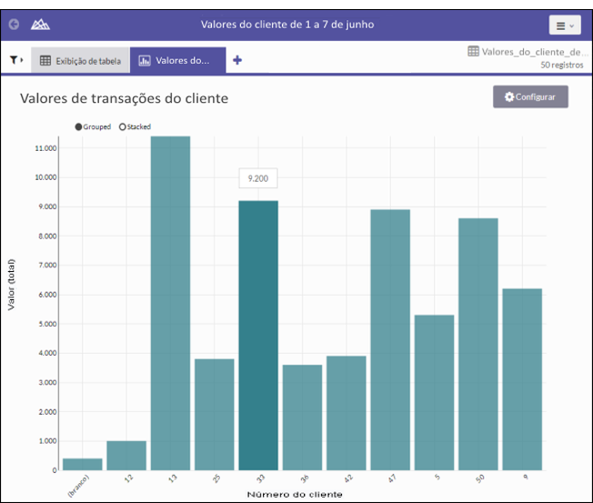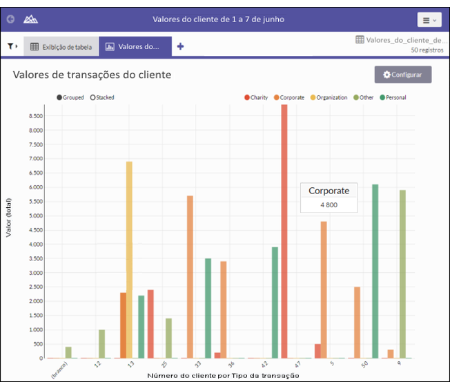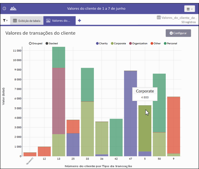 Selecione a configuração da exibição agrupada x empilhada no canto superior esquerdo do gráfico.