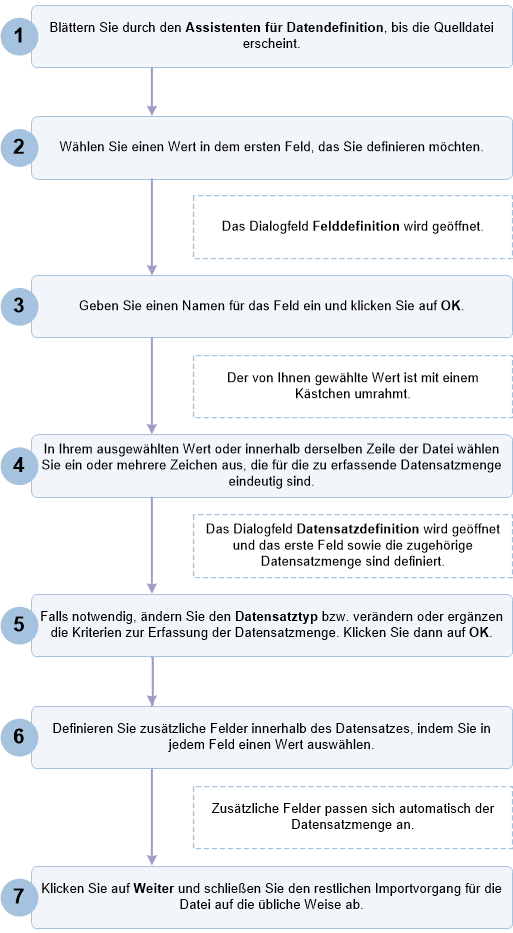 Der restliche Definitions- und Importprozess ähnelt dem Ablauf der Definition und des Imports anderer Datenformate wie Excel und Textdateien mit Trennzeichen.