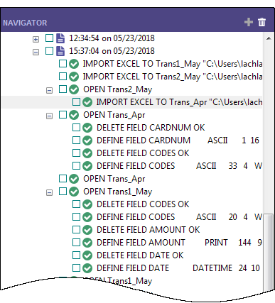 The log records the exact sequence of commands executed during each Analytics session, and saves them as part of the Analytics project.