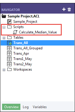ACLScript is the command language that forms the basis of Analytics. Scripts are stored in Analytics projects. Individual scripts appear in the Navigator, and are prefaced by the script icon