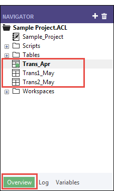 You should now have three new Analytics tables in the Overview tab of the Navigator. These tables contain read-only copies of the Excel data. They do not contain the Excel source data itself.