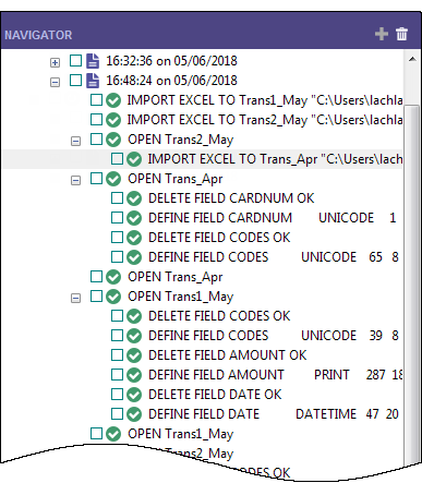 The log records the exact sequence of commands executed during each Analytics session, and saves them as part of the Analytics project.