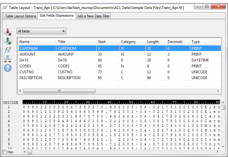 Here's what the Trans_Apr table layout looks like. You'll quickly learn your way around table layouts as you become more familiar with Analytics. You can do a lot of useful things in the table layout.