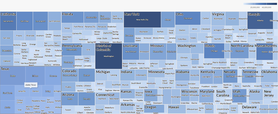 Para visualizar estos datos, usa un diagrama de árbol (treemap). Agrupa los datos por estado y, a continuación, por ciudad. También usa los siguientes ajustes adicionales: