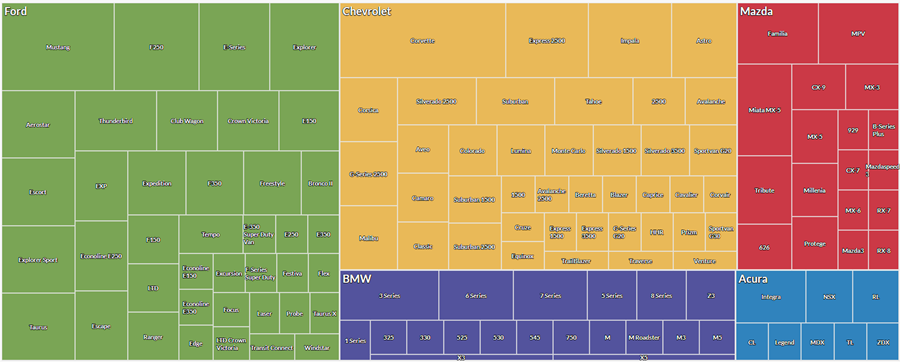 Basándose en los resultados, puede ver de qué forma se distribuye el inventario entre las marcas y los modelos: