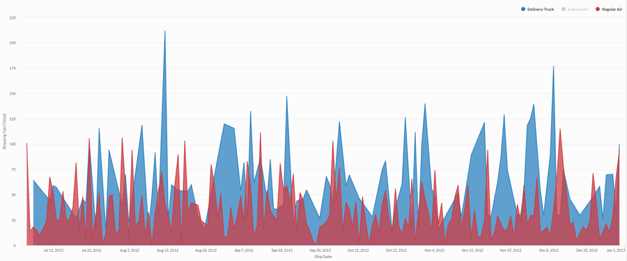 En vous appuyant sur les données commerciales agrégées sur une période de 4 ans, vous devez communiquer la tendance des coûts de livraison pour chaque mode de livraison utilisé par votre organisation. Pour ce faire, vous créez un graphique en aires standard qui présente la tendance des coûts, ventilée par mode de livraison, sur la période :