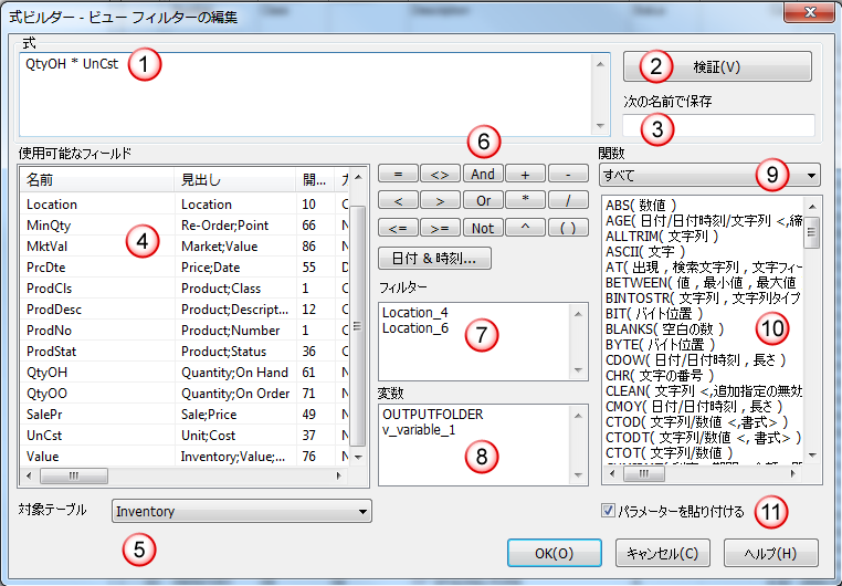 新しい式を作成するか、既存の式を編集するためのテキスト 式に必要な構文を手入力したり、式ビルダーに含まれるリストやボタンを使用して、必要な情報を入力することができます。 リストとボタンを使用した場合、その情報は[式]テキスト ボックス内の現在のカーソル位置に追加されます。 |
