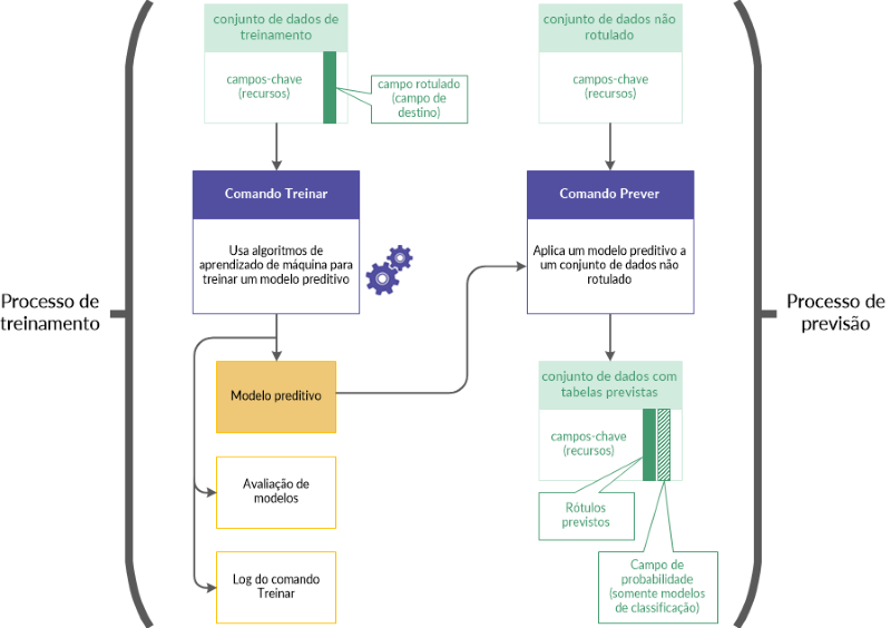 Em seguida, é executado o processo de previsão. Esse processo aplica o modelo preditivo gerado pelo processo de treinamento a um conjunto de dados novo e não rotulado que contém dados similares aos dados no conjunto de dados de treinamento.