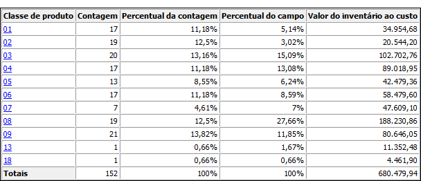 Os resultados mostram que o valor do inventário se concentra em quatro classes de produto: 03, 04, 08 e 09.