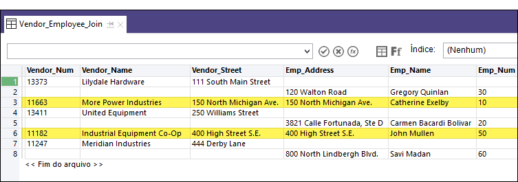 No exemplo abaixo, uma tabela mestre de fornecedores e uma tabela mestre de funcionários são associadas usando o campo de endereço em cada tabela como chave comum (Vendor_Street e Emp_Address). A tabela de saída contém dois registros associados. No exemplo, os registros não associados de cada tabela também são incluídos na tabela de saída, que é uma opção que você pode escolher.