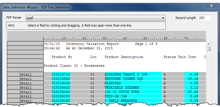 Inicialmente, a definição de arquivos de imagem de impressão ou PDF pode parecer muito difícil, particularmente para arquivos com dados desalinhados. Com a prática, você ficará mais experiente na avaliação da estrutura dos dados em um arquivo de origem na identificação dos métodos adequados definir essa estrutura.