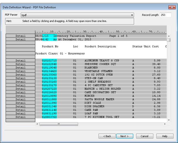 - O arquivo Inventory.pdf é mais desafiador porque contém dados desalinhados (a menos que você analise o arquivo página por página). O Analytics não consegue definir automaticamente nenhuma parte do arquivo desalinhado. Portanto, você deve criar uma definição manual desde o início.