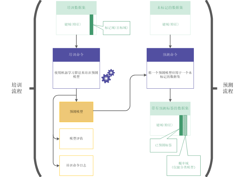 培训和预测工作流由两个相关的流程以及两个相关的数据集组成。