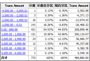 例如,您可以根据发票金额域对应收帐款表进行分层,以便将记录分组到 $5000 间隔中 – 从 $0 到 $4,999.99 的发票,从 $5,000 到 $9,999.99 的发票,等等 – 以及查找每个间隔的交易总数和交易总金额。