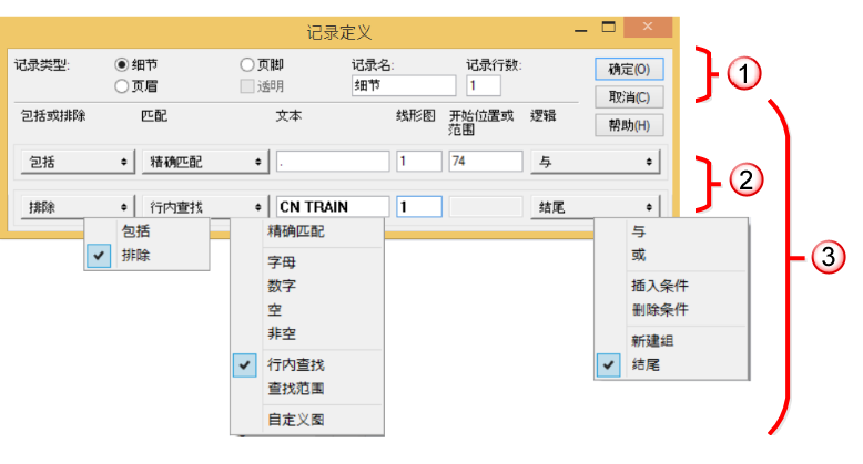 下图显示了包含两个准则的记录定义对话框,它的三个菜单已打开。这些菜单和相邻的文本域可供您用来修改或进一步构建用以捕捉记录集的准则。