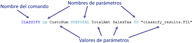 El nombre del comando va seguido de uno o más parámetros que se especifican como nombre_del_parámetro valor_del_parámetro.
