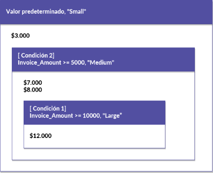 - Valor asignado = Medium Si se invierte el orden de las condiciones, al importe se le asigna el valor "Medium", lo cual es correcto porque el importe es superior a $5.000. Sin embargo, la asignación de valores no está funcionando de la manera deseada porque Invoice_Amount >= 5000 es una condición menos restrictiva y está captando importes que usted no desea captar.