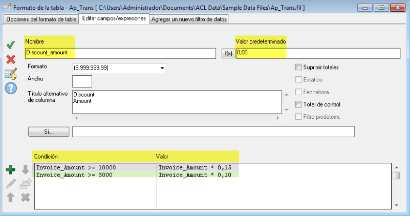 El siguiente ejemplo muestra la definición del campo calculado Discount amount en el cuadro de diálogo Formato de tabla. El valor literal 0,00 aparece en el campo Valor predeterminado. Los valores calculados Invoice_Amount * 0,10 e Invoice_Amount * 0,15 aparecen en una condición independiente.