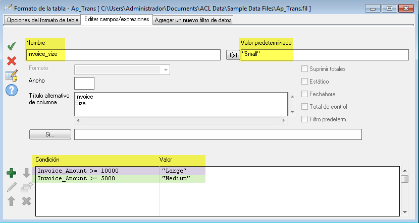 Recuerde que una vez que Analytics asigna un valor de campo calculado a un registro, ese valor no se cambia. Por lo tanto, en el siguiente ejemplo, se asigna "Large" (grande) al registro que contiene un importe de factura de $12.000, y aun cuando el registro cumple la Condición 2, el valor no se actualiza a "Medium" (medio).