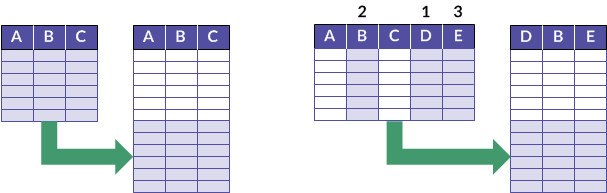 | ビュー単位、フィールド単位の抽出および追加 | 図の右側の 2 つのテーブルに示すように、 ソースとターゲット テーブルのフィールドの数と順序同じである必要がありません。 このような状況では、ターゲット テーブルのフィールド数と順序に一致するように、ソース テーブルでビューを調整することか、抽出するときに適切なフィールドを選択することができます。 次の例では、D、B、E の順序でビューにフィールドを配置するか、フィールドを選択します。フィールド A および C を省略します。 |