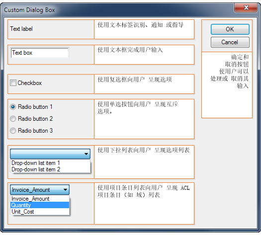 在对话框生成器中,您可以通过向该对话框中添加用户输入控件来设计和生成自定义对话框。