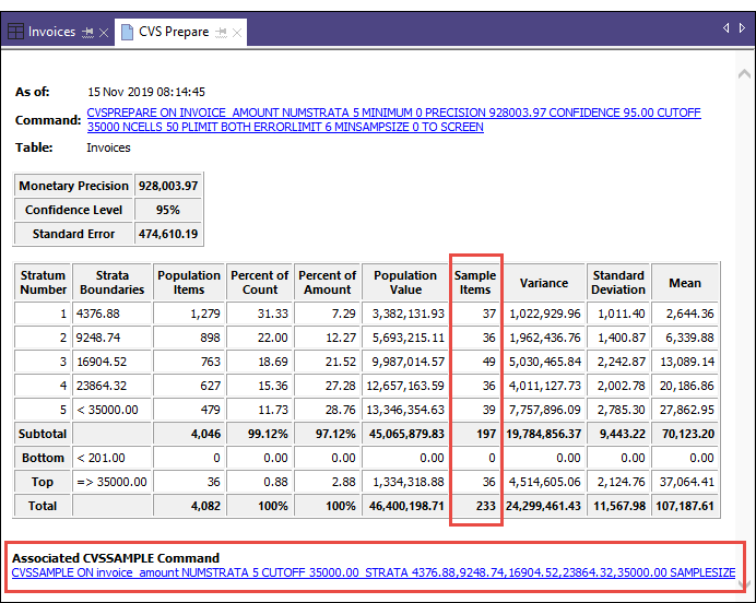 Input values affect the sample size calculated by Analytics. You can experiment with different input values in the CVS Prepare dialog box to see how they affect the sample size.