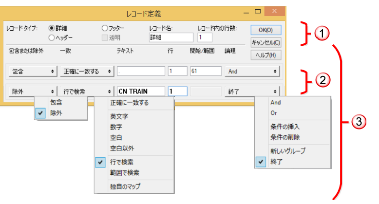 以下の図は、[レコード定義]ダイアログ ボックスで、2 つの条件が設定され、3 つのメニューが開いているところを示します。それらのメニューと、隣接するテキスト フィールドを使用して、レコードのセットを取り込む条件を修正または作成します。